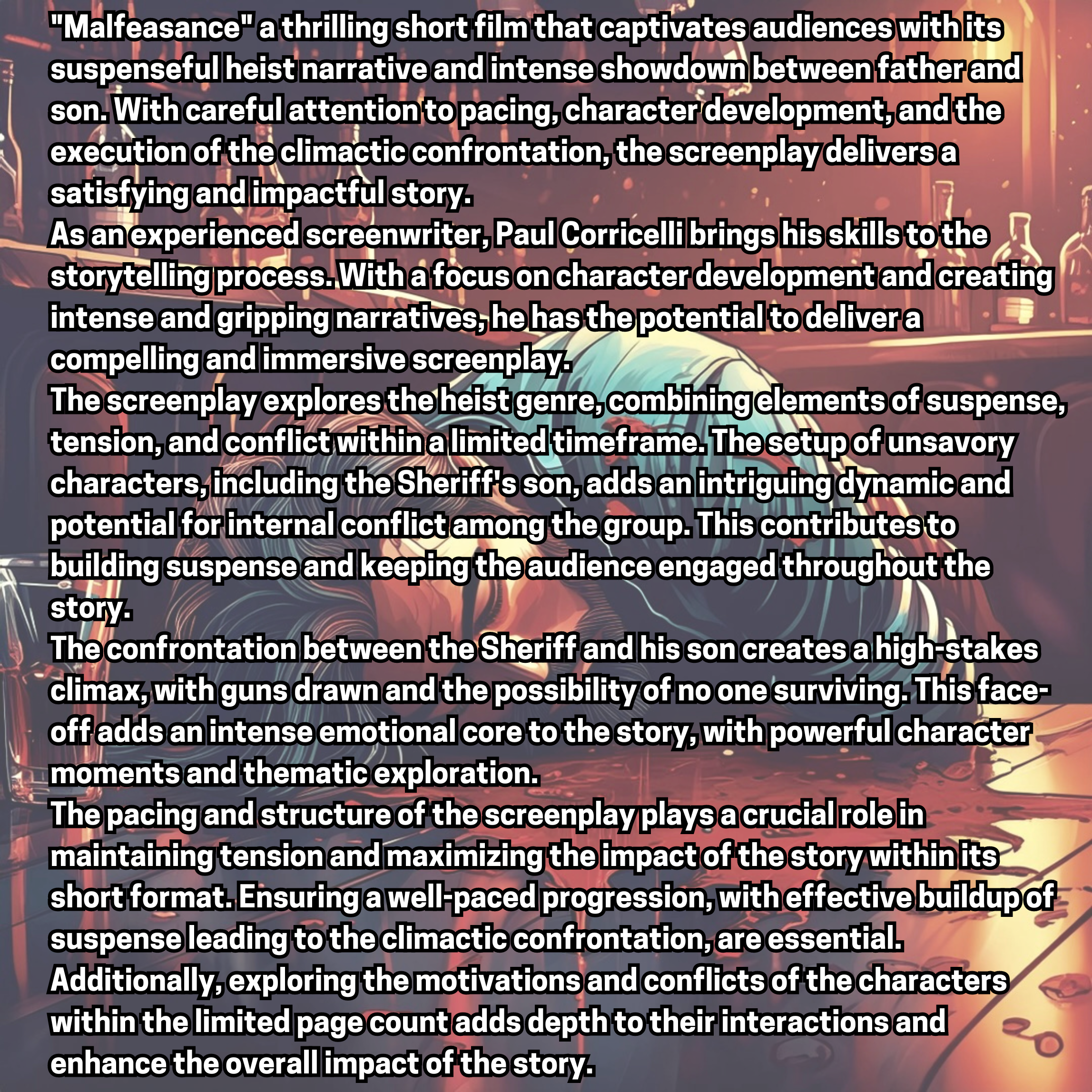Malfeasance – Four unsavory men, including the Sheriff’s son, make plans to pull off the biggest heist in their pathetic lives, but when they start to turn on themselves and all hell breaks loose, they’re interrupted by the Sheriff, and no one may walk out alive.