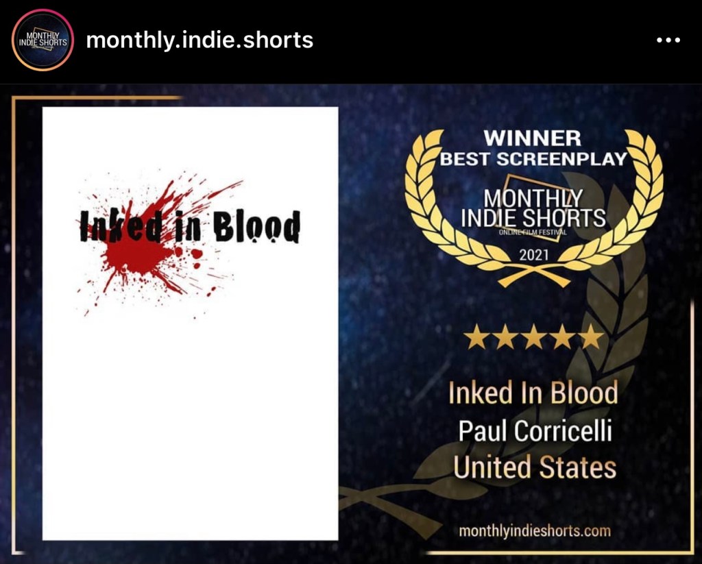 Inked In Blood Won Best Feature Screenplay! Posted on March 4, 2021 by mywritersroom Thanks to Monthly Indie Shorts!