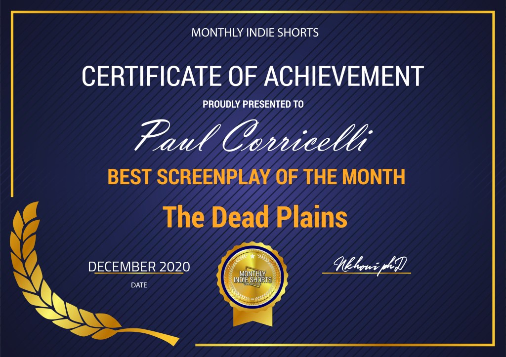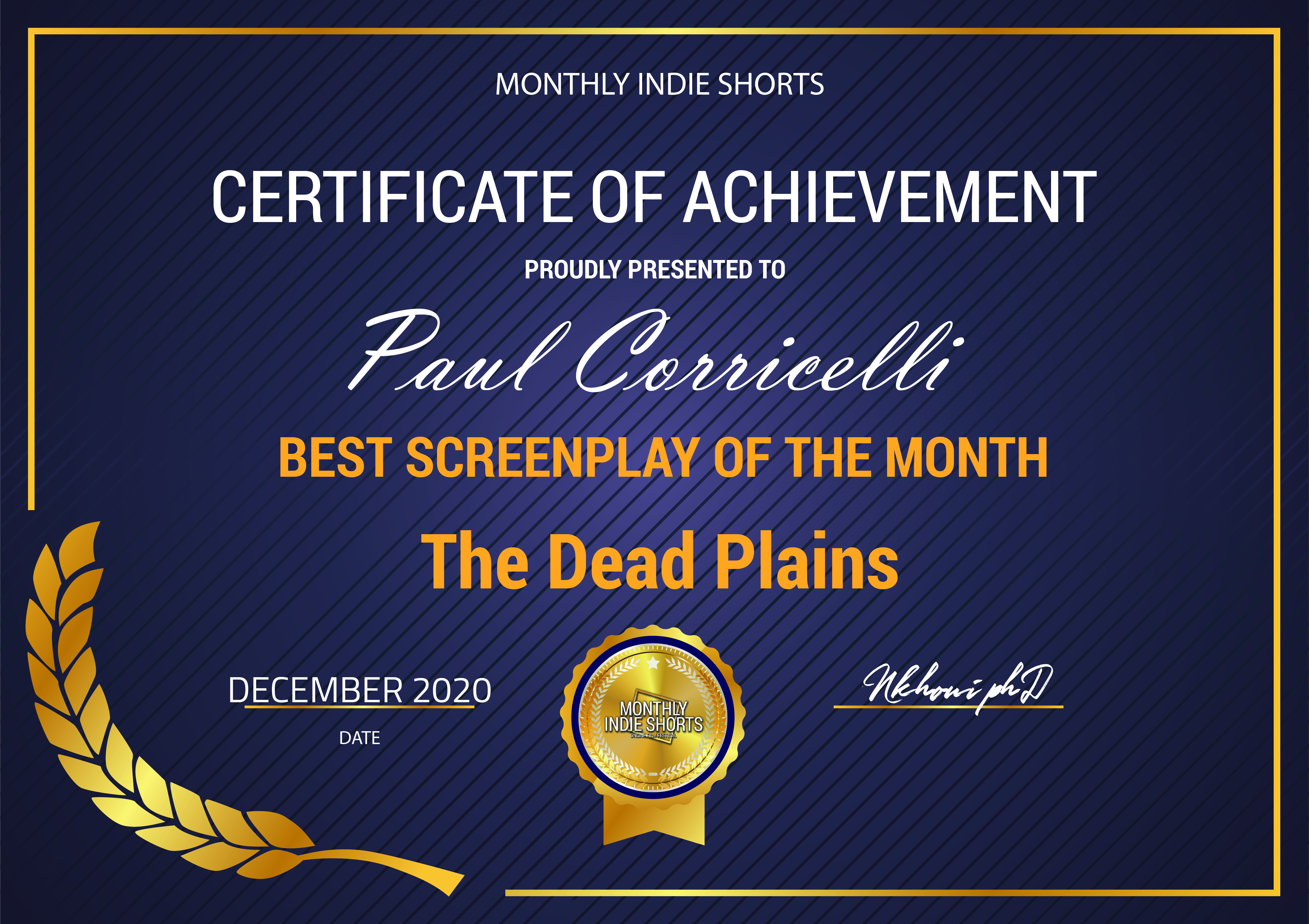 THE DEAD PLAINS Wins Best Short Screenplay Of The Month! Posted on March 4, 2021 by mywritersroom Thanks to the Monthly Indie Shorts Festival!